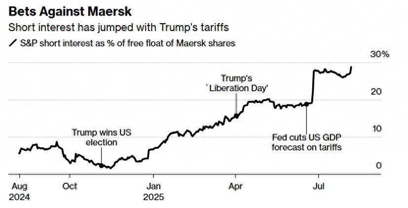 根据标普全球市场情报(S&P Global Market Intelligence)的统计数据,目前相当于马士基公司(A. P. Moller-Maersk A/S)自由流通股近三分之一的股份被借出,这是自2014年开始收集数据以来的最高规模空头水平。这一指标表明市场的卖空仓位在今年激增,较4月初美国总统唐纳德·特朗普宣布对所有美国贸易伙伴征收对等关税的全面计划时则出现约15%的大幅上升。